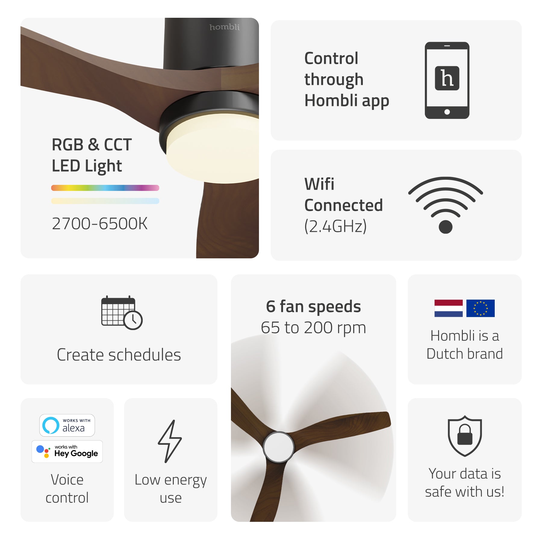 The Hombli Smart Ceiling Fan brings a fresh take on a proven classic. Designed to be more than just a cooling device, you can adapt this fan to your needs and your lifestyle. With a built-in smart LED light and app control, it's easy to customize the atmosphere in any room. Whether you want a breeze on a hot day, or to gently circulate warm air in winter, it’s all possible—quietly and efficiently. And best of all, it helps reduce your energy use without reducing comfort.