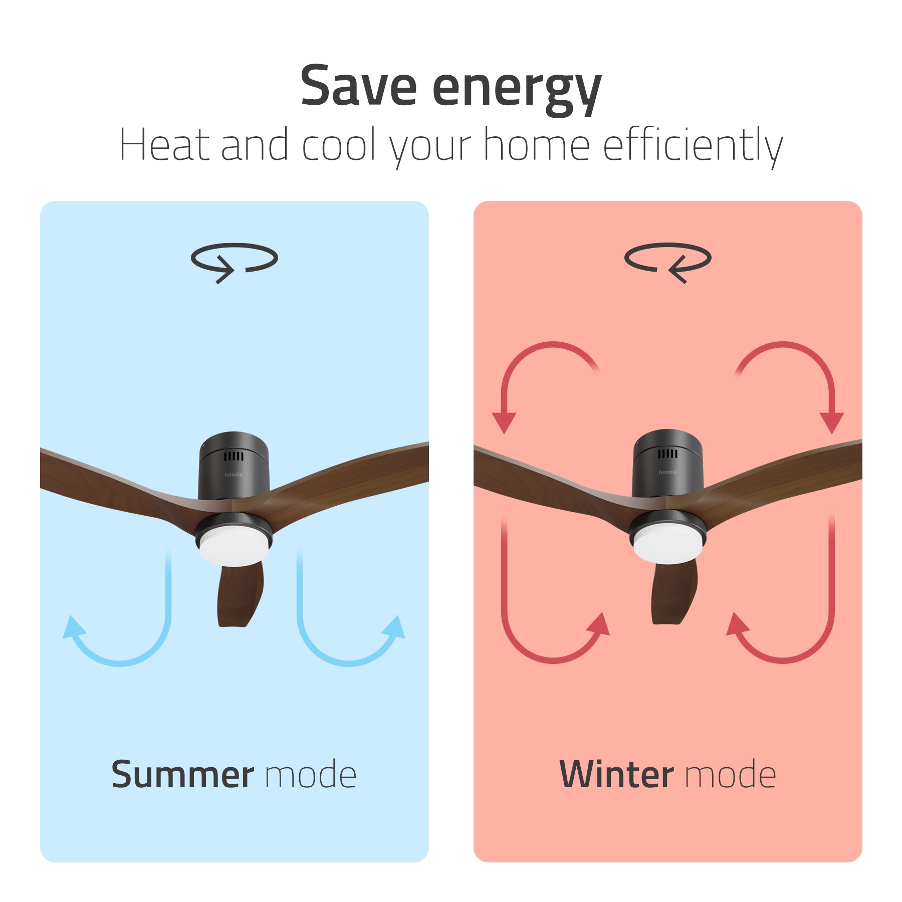 The Hombli Smart Ceiling Fan is designed to make your home more energy-efficient in every season. In summer, it creates a cooling breeze that helps you feel comfortable without cranking up the air conditioning. In winter, switch to the reverse rotation mode to gently push warm air down from the ceiling—improving your heating system’s performance. This works, because warm air from a heat source rises up, but is not useful for you near the ceiling. By pushing it down, you get to enjoy the warm air again and don't need to turn up the thermostat further. This small adjustment helps lower your energy bills without sacrificing warmth or comfort.