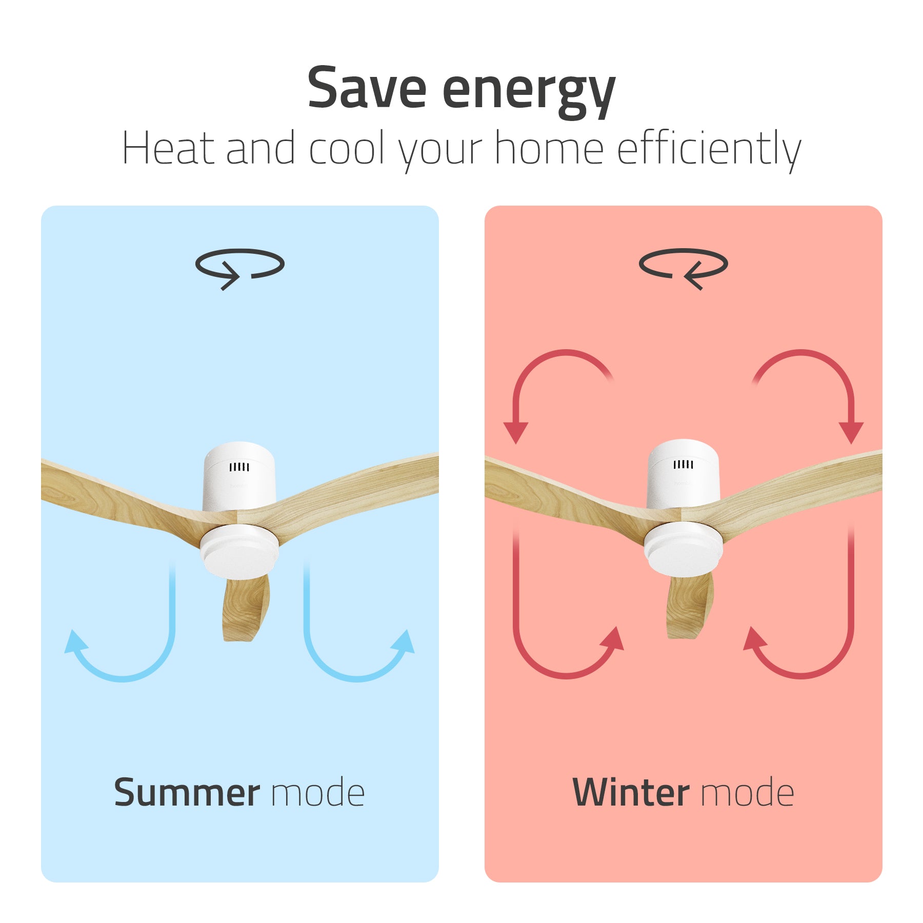Der Hombli Smart Ceiling Fan ist darauf ausgelegt, Ihr Zuhause in jeder Jahreszeit energieeffizienter zu machen. Im Sommer sorgt er für eine kühlende Brise, die Ihnen Komfort bietet, ohne dass Sie die Klimaanlage stark aufdrehen müssen. Im Winter können Sie den Modus für die Rückwärtsrotation aktivieren, um die aufsteigende warme Luft sanft wieder nach unten zu drücken – und so die Effizienz Ihres Heizsystems verbessern. Denn warme Luft von einer Wärmequelle steigt nach oben, bleibt aber in Deckennähe ungenutzt. Indem der Ventilator die Luft wieder nach unten bewegt, können Sie die Wärme erneut nutzen und müssen den Thermostat nicht weiter aufdrehen. Diese kleine Anpassung hilft dabei, Ihre Energiekosten zu senken, ohne auf Wärme oder Komfort zu verzichten.