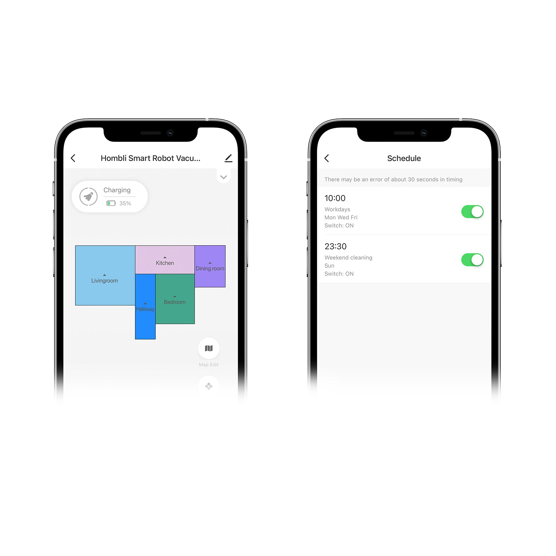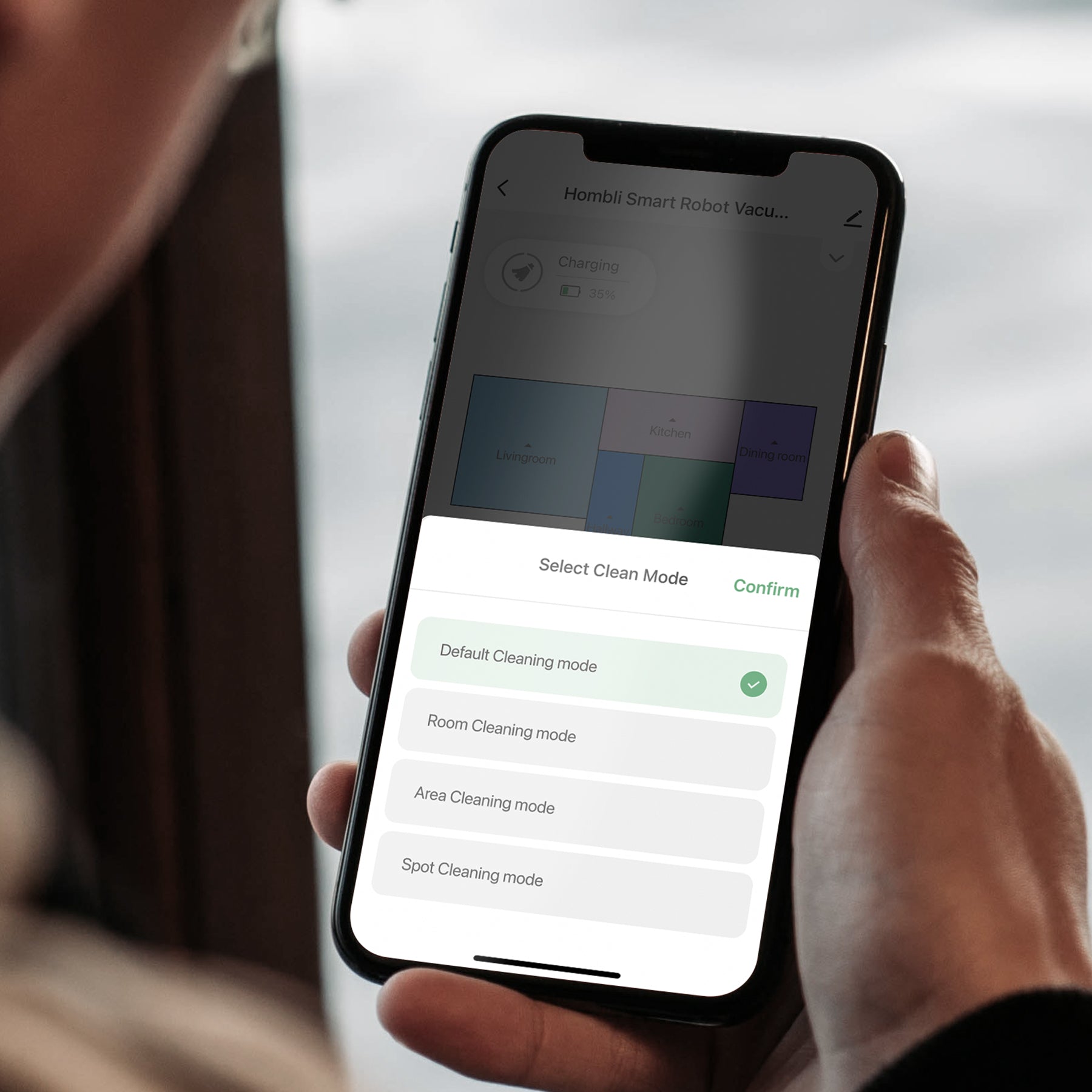 Puedes añadir fácilmente el robot aspirador inteligente a la aplicación Hombli conectándolo a la red Wi-Fi. Con la aplicación Hombli, el robot aspirador inteligente se pone en marcha fácilmente con un solo toque. ¿Quieres hacer una pequeña limpieza en casa? Solo tienes que seleccionar una habitación en la aplicación Hombli y dejar que el robot aspirador haga su trabajo.