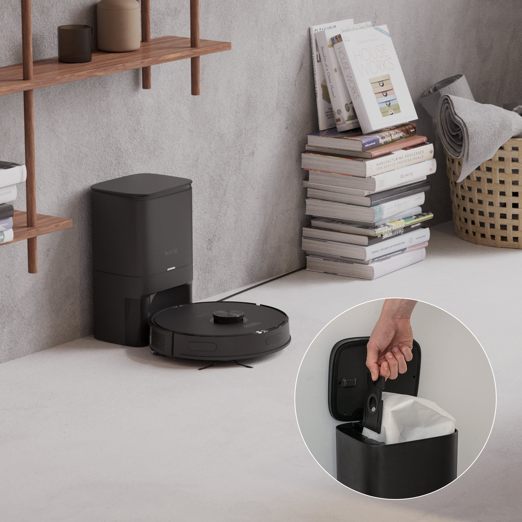 Puede colocar fácilmente la Homebase en cualquier lugar del suelo y conectarla simplemente enchufándola a una toma de corriente. La Homebase vacía automáticamente el depósito de polvo de la aspiradora inteligente cuando se conecta a la Homebase. La Homebase puede recoger hasta cuatro litros de polvo y suciedad y la bolsa de polvo de la Homebase se puede sustituir fácilmente.