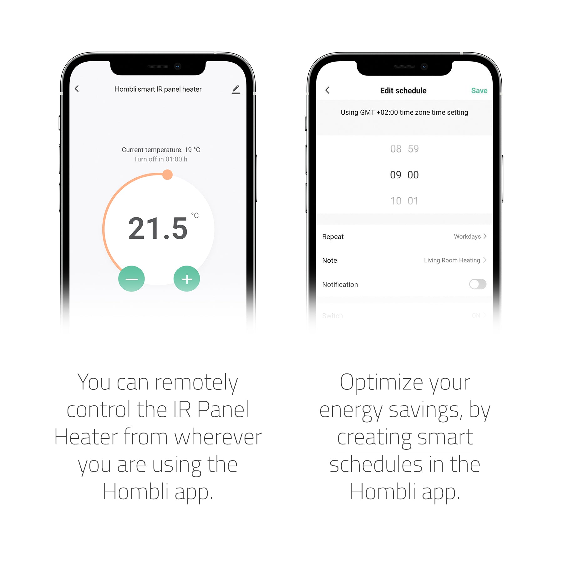 Le Hombli Smart IR Panel Heater fait partie des nombreux produits de la maison connectée Hombli que vous pouvez facilement combiner et contrôler dans l'application Hombli. Par exemple, combinez plusieurs panneaux chauffants dans différentes pièces de la maison avec un horaire intelligent dans l'application Hombli.