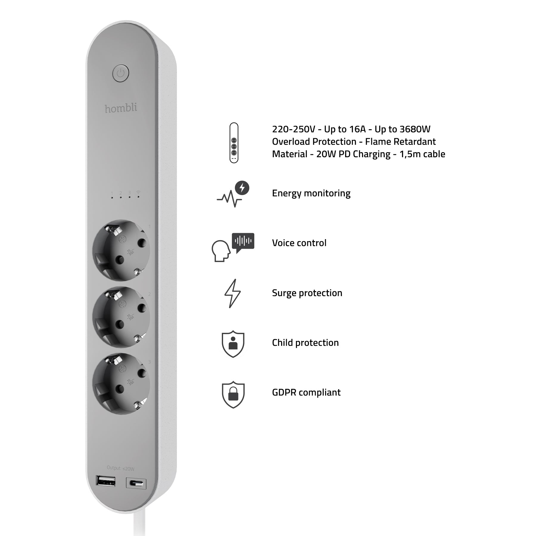 Lorsque les prises de courant disponibles sont limitées, la Hombli Smart Powerstrip est la solution parfaite pour surveiller l'énergie. Avec la capacité de surveiller trois prises et de voir l'historique d'utilisation dans l'application, vous obtenez des informations précieuses pour commencer à réduire vos factures d'énergie. Elle sert de compteur d'énergie facile à utiliser pour plusieurs appareils.
